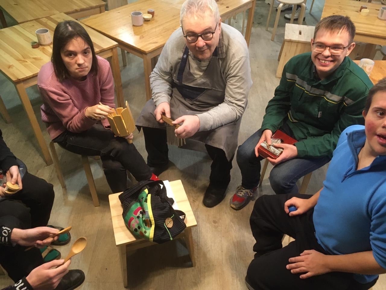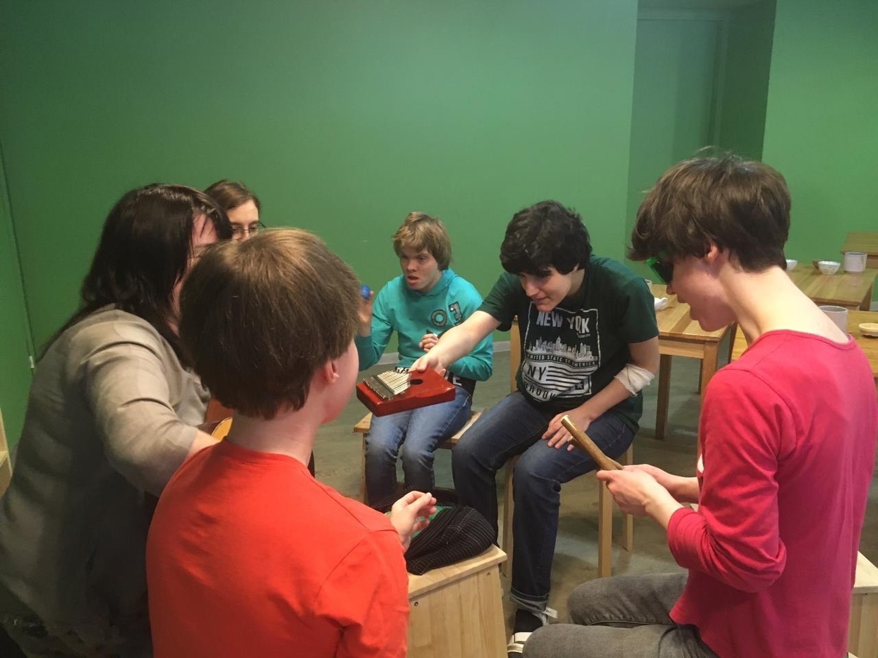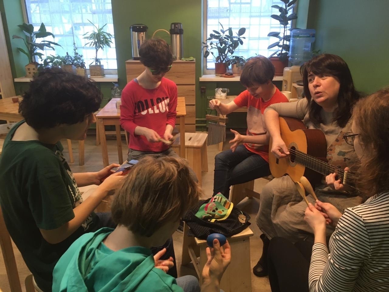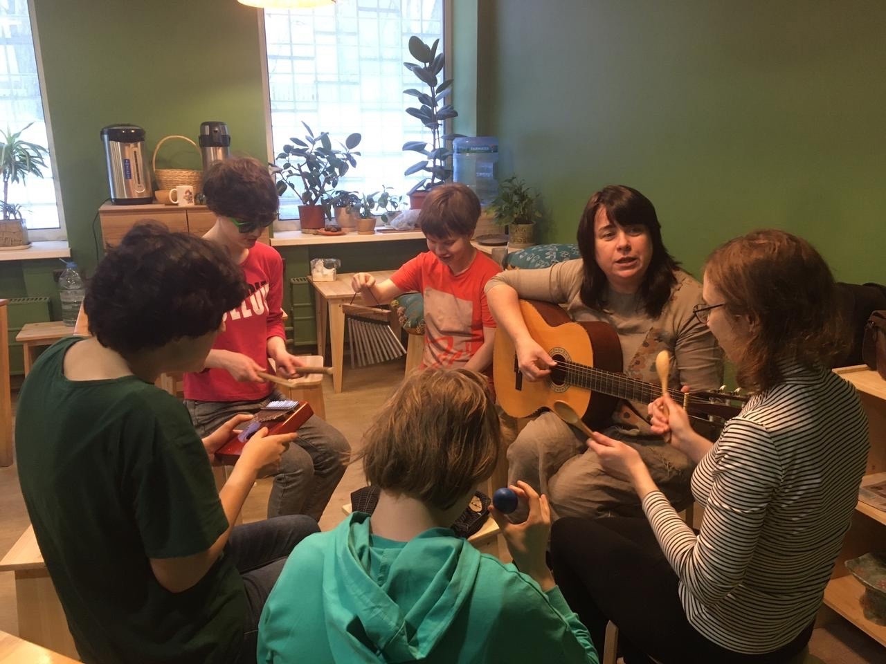 Первое занятие ребятам показалось веселым: пели под гитару, осваивали разные музыкальные инструменты.