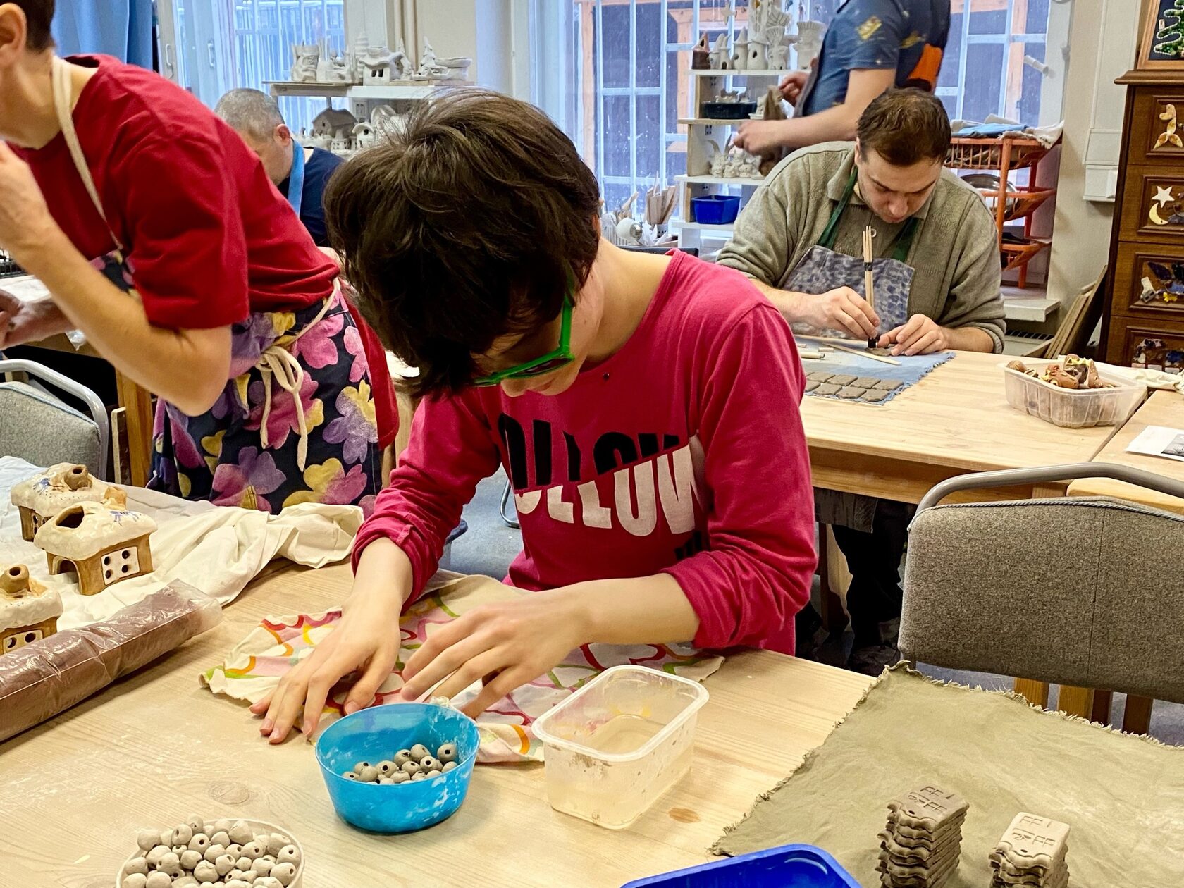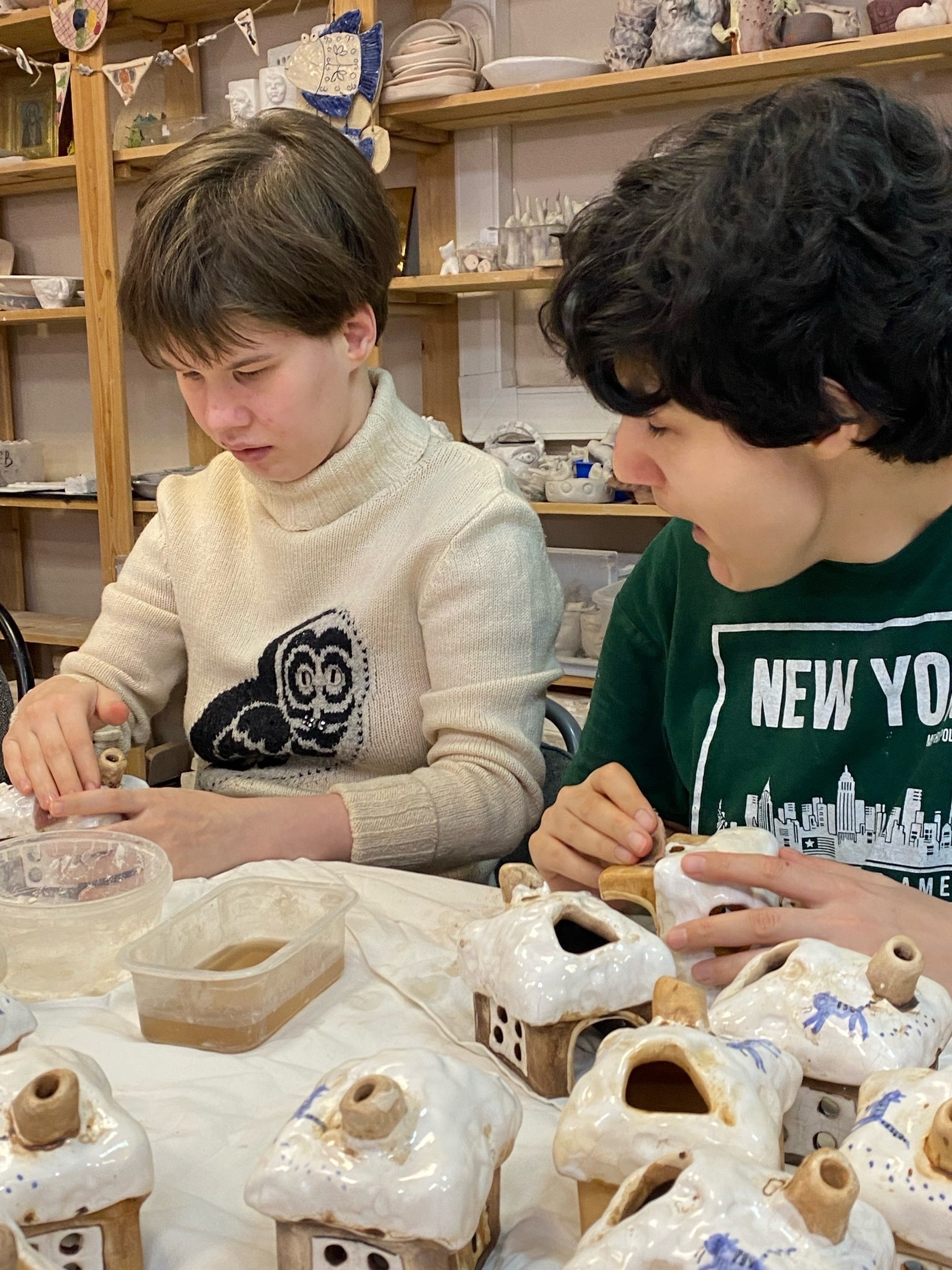 А после занятия продолжается работа. Аня валяет шарики для будущего панно, Ира и Аня замывают домики. А Женя пока что просто передаёт всем привет.