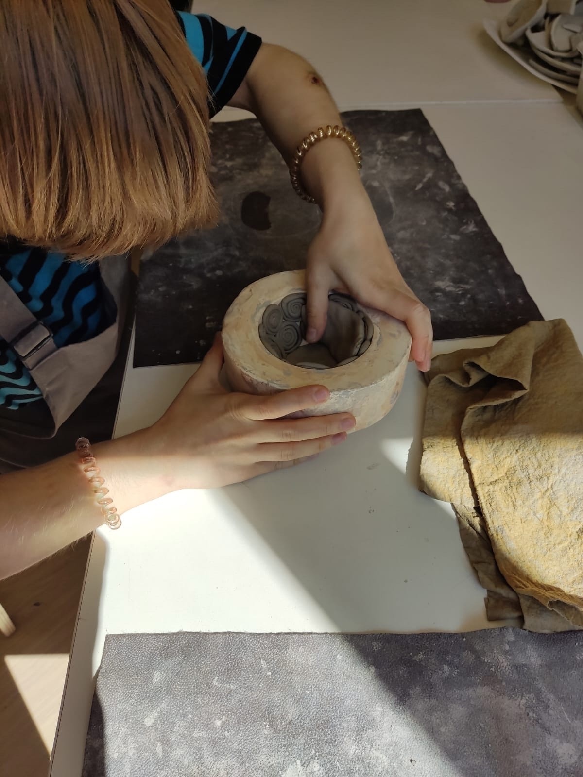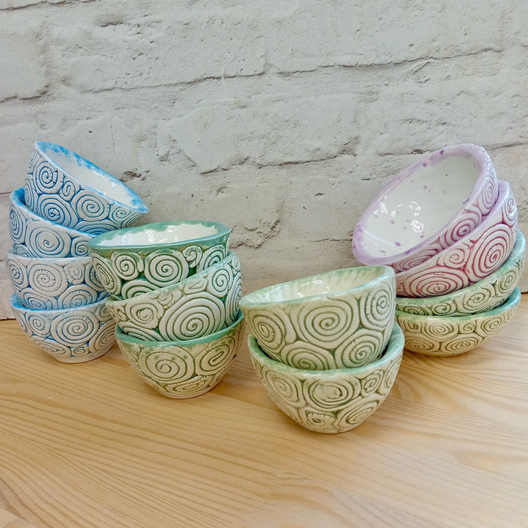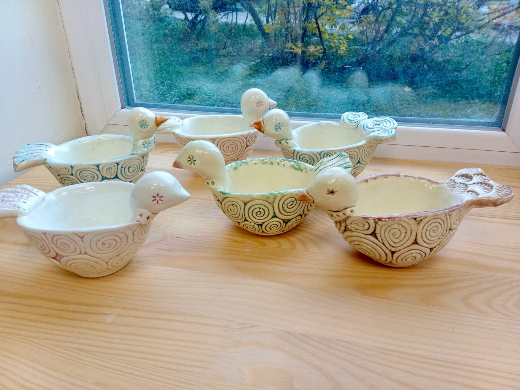 Мы делали несколько постов о том, что лучше всего у Насти получается писать абстрактные картины - одна из её работ даже участвовала в выставке. Но с открытием керамички в Бутово обнаружился новый Настин талант: лепка узорчатых пиал. На видео вы можете посмотреть, как Настя работает, а в галерее уже результат - обожженные изделия. Кстати, с помощью тьютора из Настиных пиалочек получаются еще и такие вот "птички", как на фото.