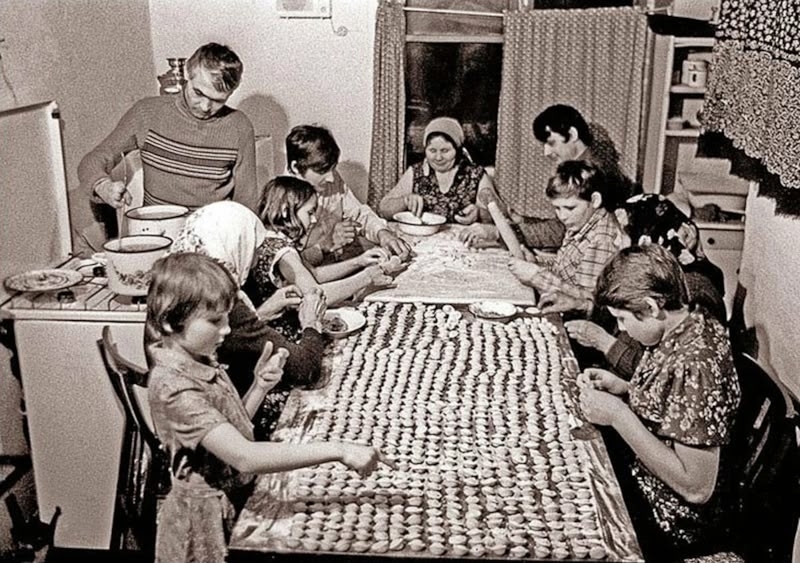 Да, по классике еще можно лепить вареники и пельмени. Представьте себе такой семейный формат, когда мы все сидим за столом, ведем неспешные беседы, вместе слушаем музыку или подкасты. Как на вот этом старом фото.