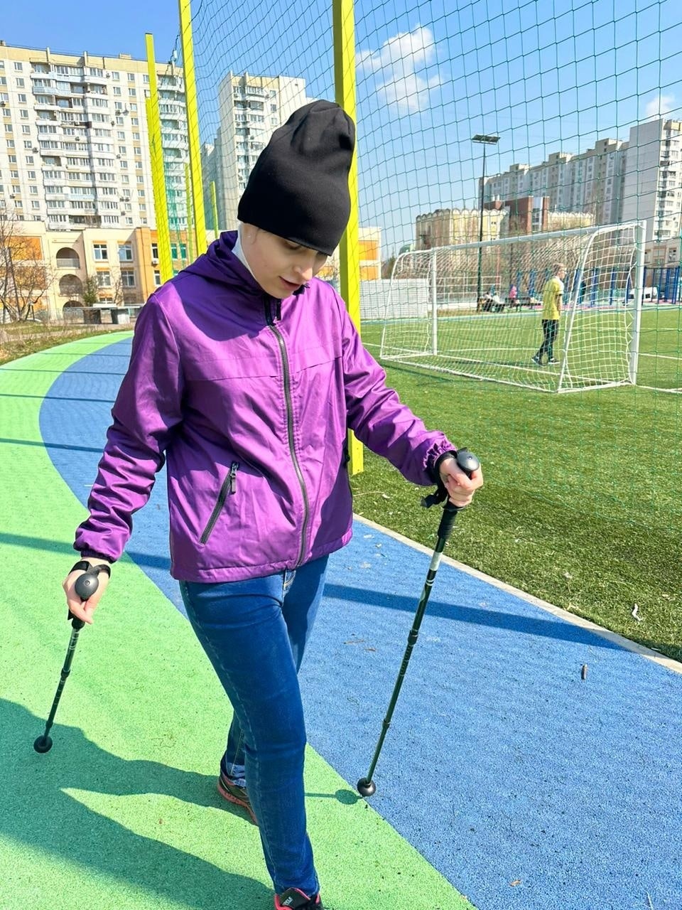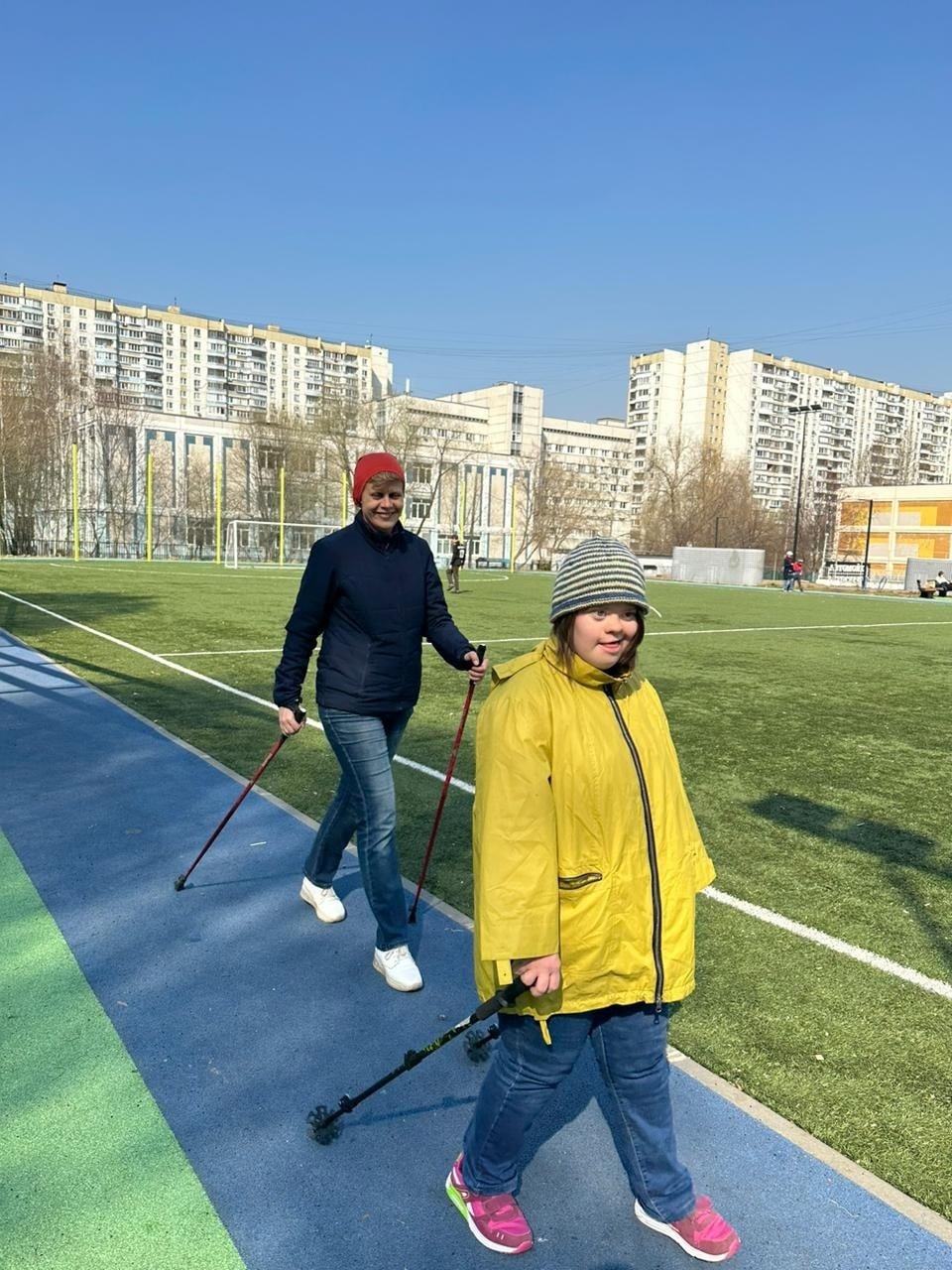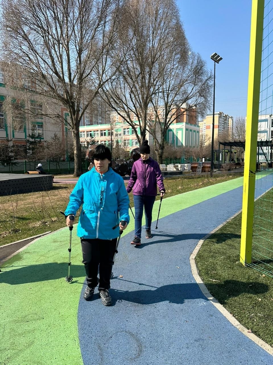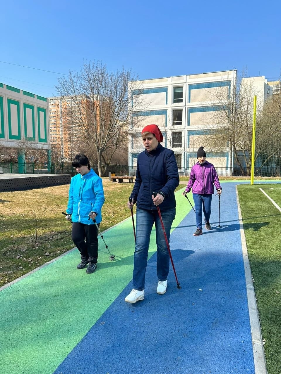 Скандинавская ходьба выходит у девочек всё лучше и лучше. Правда, Настя сейчас не занимается, у неё проблемы с ногой. Лена ходит уже очень хорошо, у Лизы К. тоже явный прогресс, но ей трудно следить за осанкой: она постоянно наклоняется, чтобы смотреть, куда ставить палки, и приходится ей всё время напоминать выпрямляться. Лиза Р., по-моему, большая халтурщица: если я на неё не смотрю, она особо не старается)) Кружочек пройдет и “давай домой”. Но в целом я у всех вижу прогресс: девочки лучше ставят ноги, лучше работают палками. И мой сын вместе с ними.