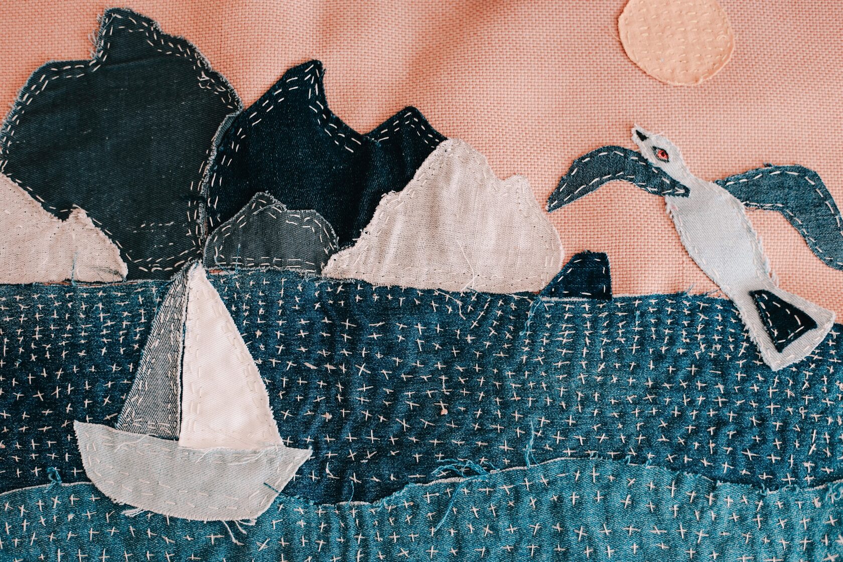 Алексей Ефремов старательно вышивает чайку, а Лена Городничая работает над морским пейзажем. Стежок за стежком и уже вырисовывается композиция. Блохина Алла создает основной фон, где планируется аппликация из морских рыбок. Действительно масштабная работа, уже более нескольких сотен стежков!