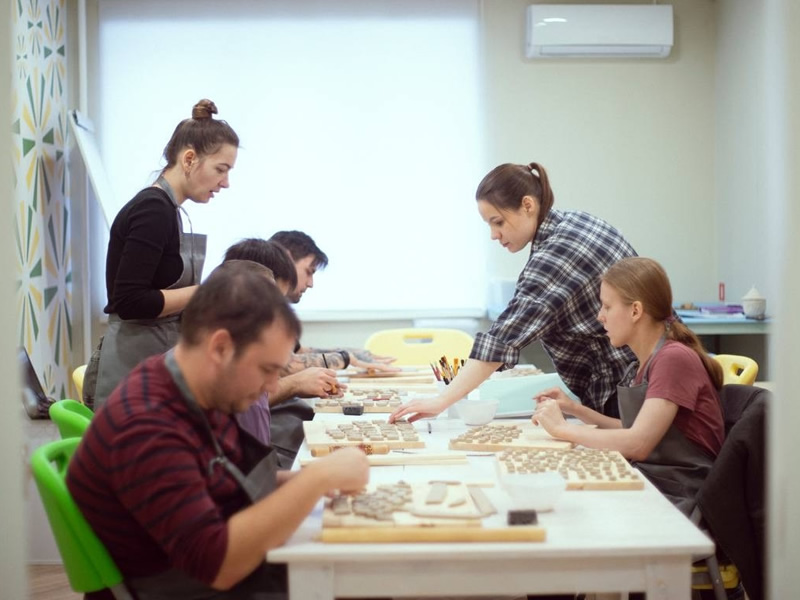 Ежедневно в мастерской проходят занятия для групп дневной полезной занятости. Ребята общаются друг с другом и с кураторами, учатся основам трудовых навыков, развиваются творчески, и их жизнь нормализуется.