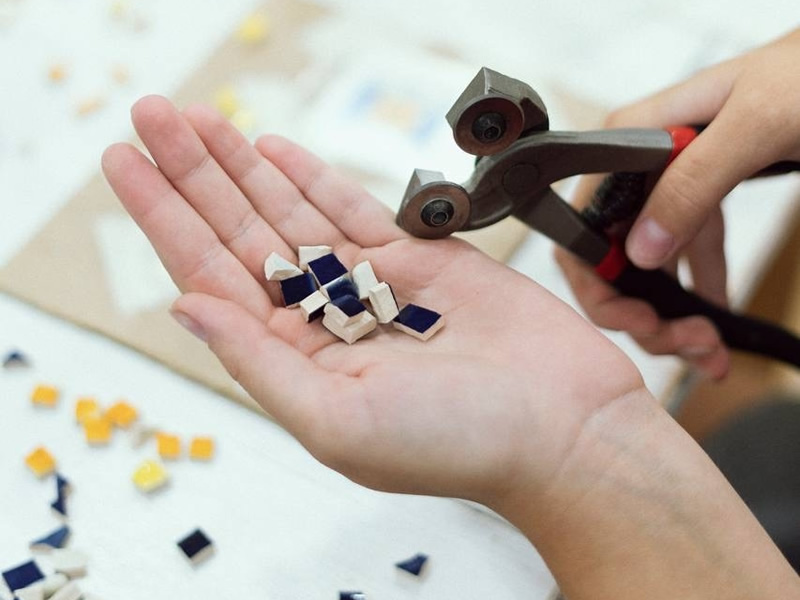В настоящий момент мастерская по мозаике готовится к изготовлению большого корпоративного заказа. Сейчас они вместе с керамической мастерской создают плитки, от которых потом будут откалывать модули для выкладки. Керамических плиток нужно очень много, и они должны быть выполнены идеально. Затем модули будут вклеивать в заранее подготовленные основы и затирать. В результате должны получиться деревянные подносы с оригинальным декором из керамической мозаики.