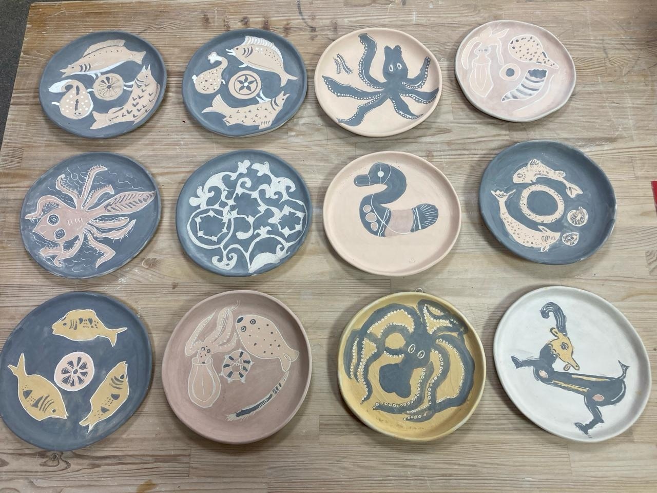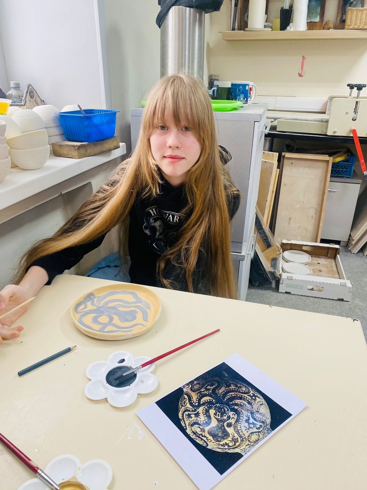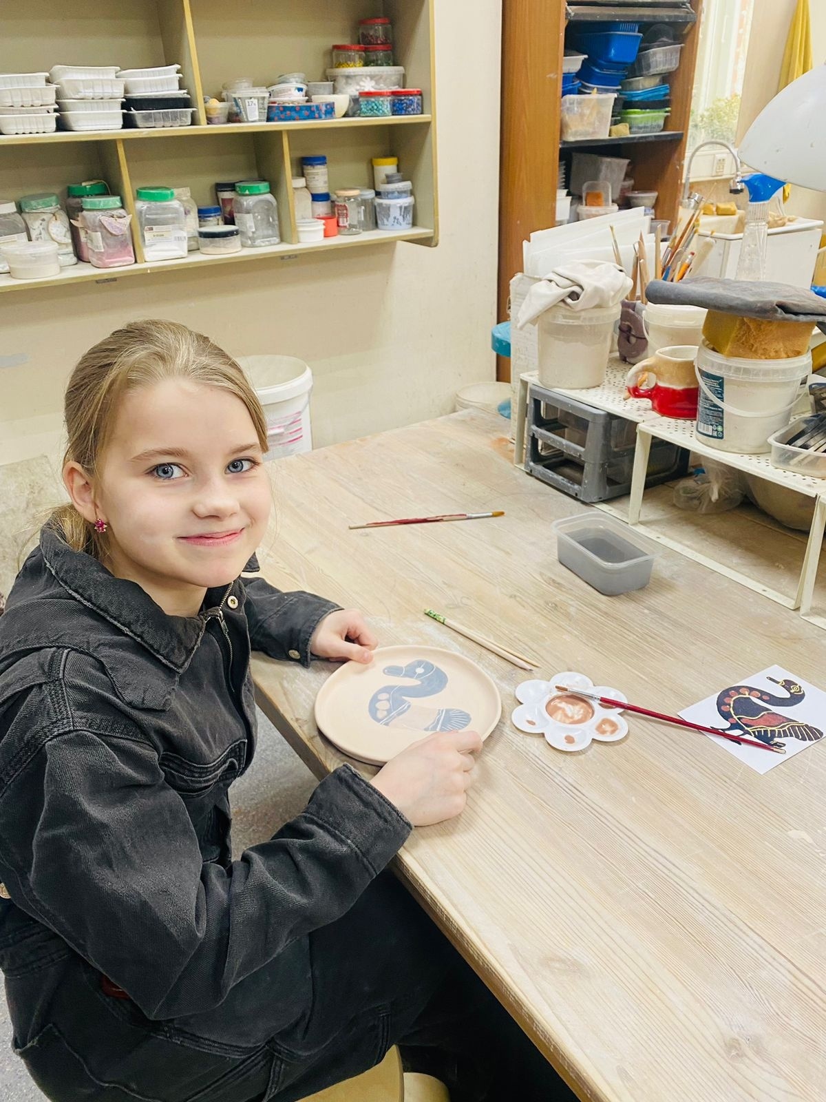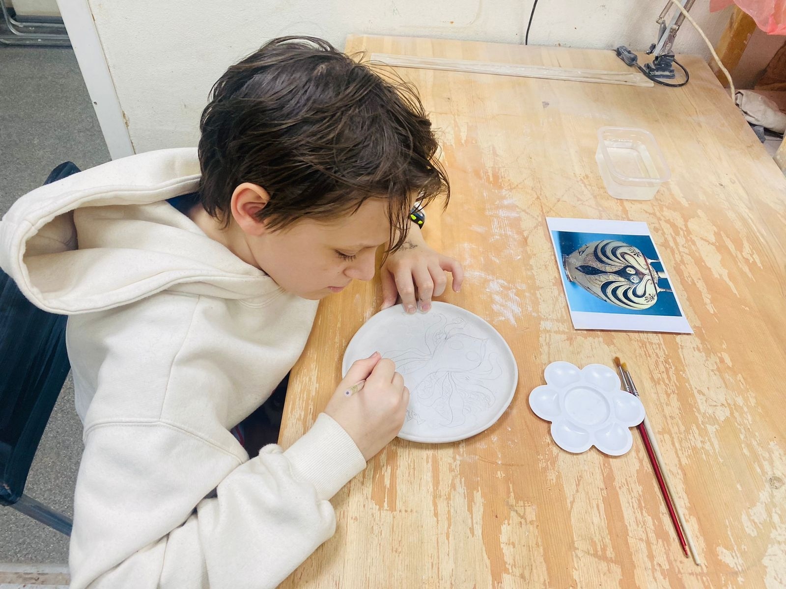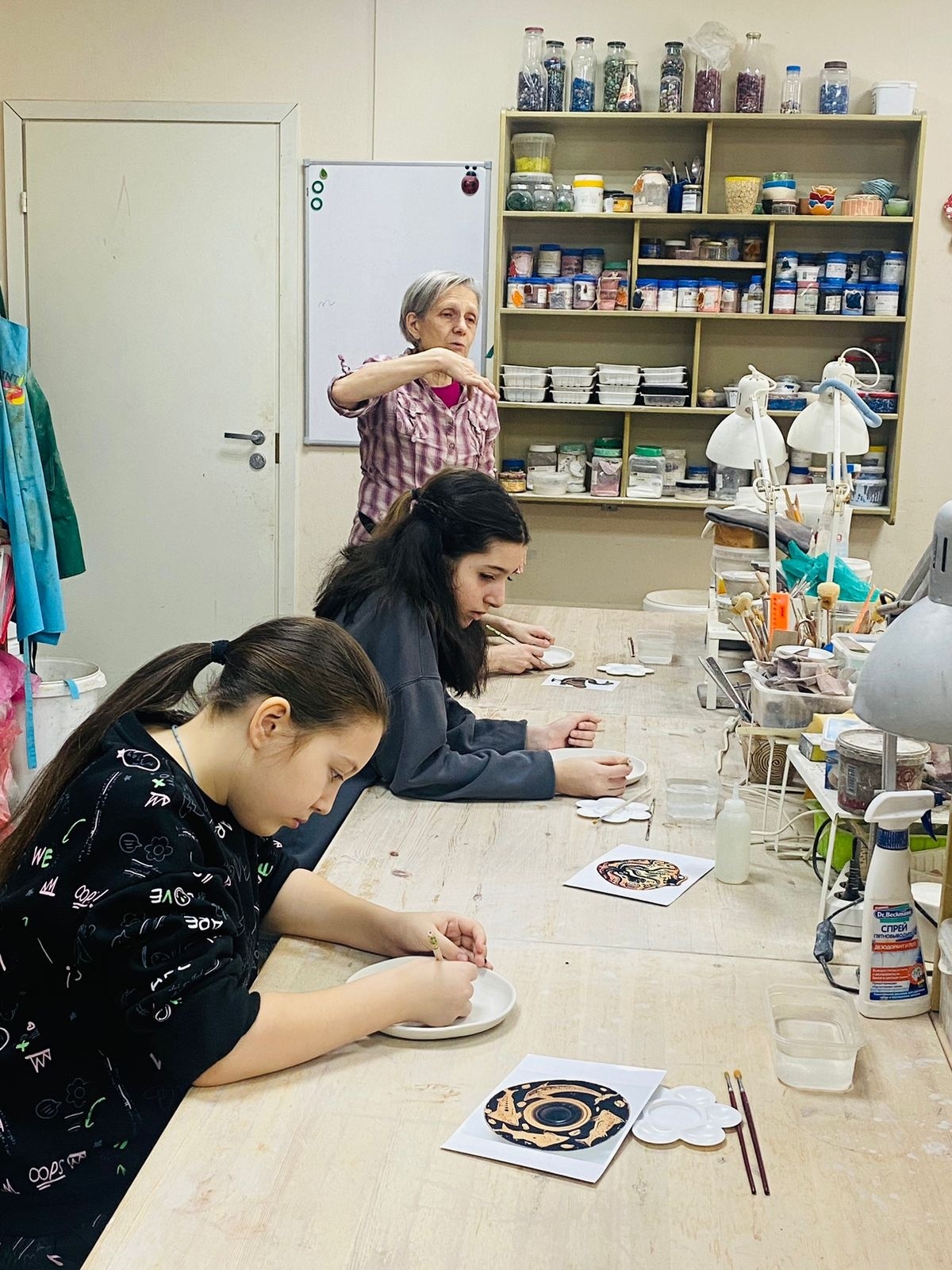 Сейчас ребята изучают античный период и поэтому на уроке с нашим куратором Аллой Гутиной они создавали керамические тарелки с природным орнаментом.