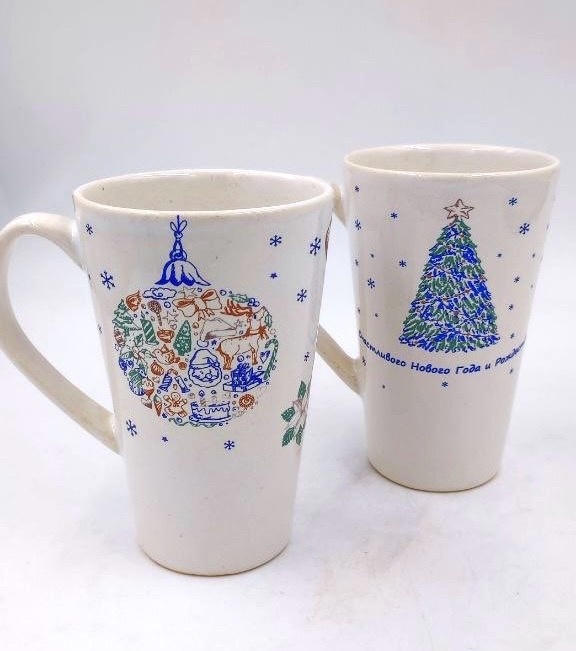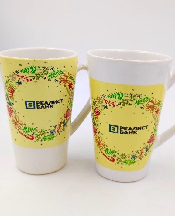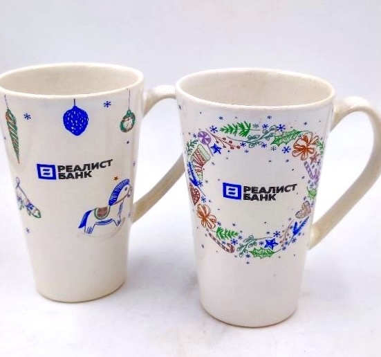 Подготовить 1200 новогодних кружек для сотрудников Реалист Банка в двух разных вариантах дизайна.