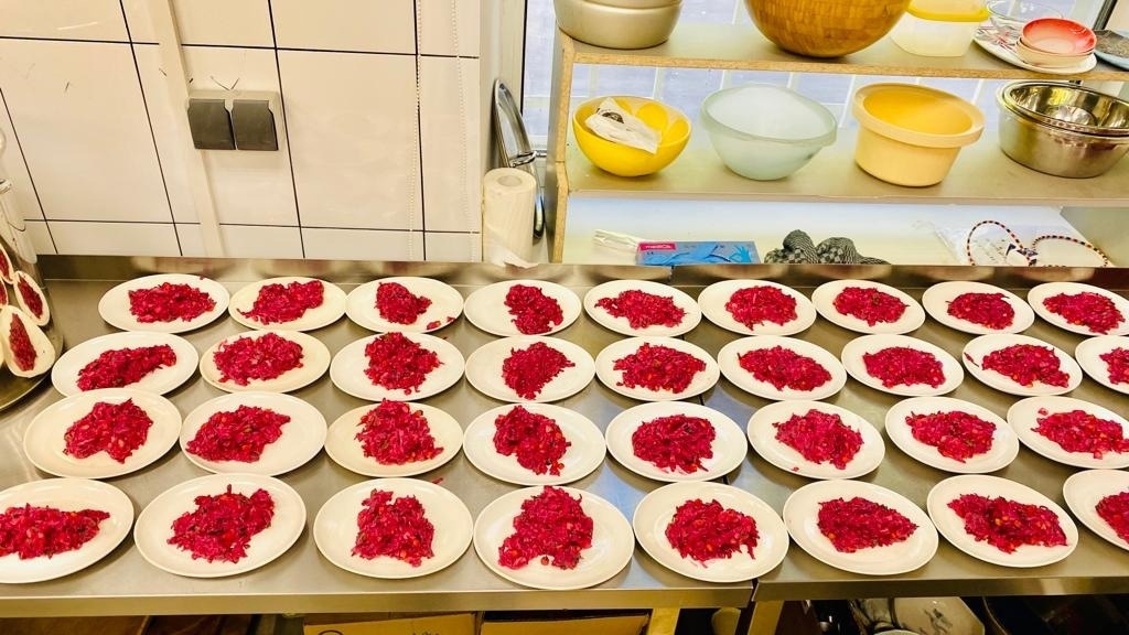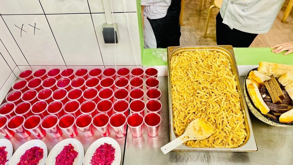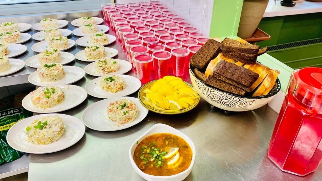А сегодня – суп солянка, крабовый салат и напиток из базилика, который всем очень понравился. Наш главный повар Ашер называет его сок Рейхан
