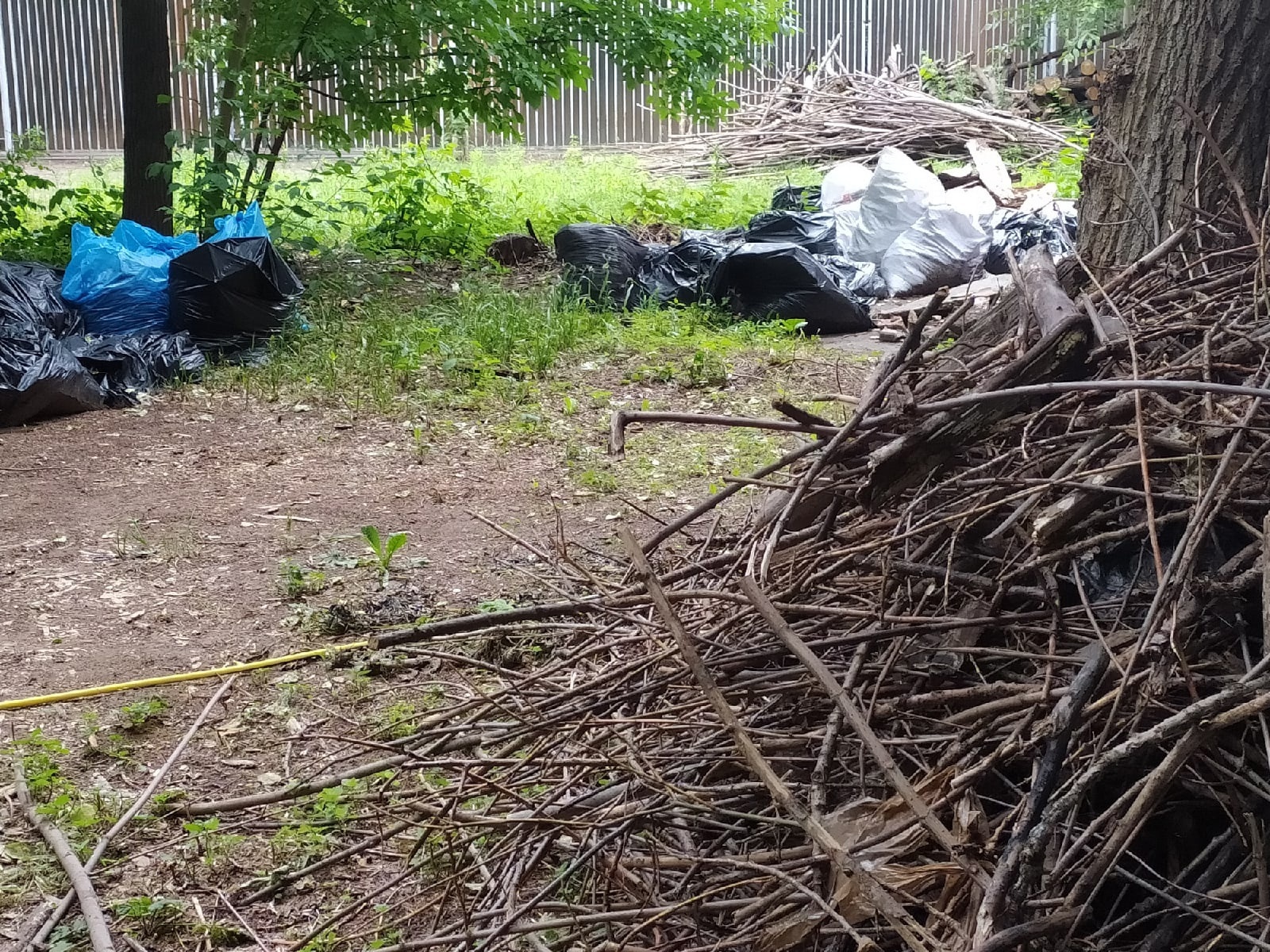 Очистили территорию от листьев, камней, бутылок, кустов, пней, щебня, кирпичей, арматуры...