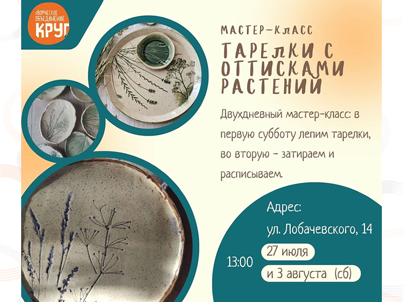 ✦ «Тарелки с оттисками растений» — двухдневный мастер-класс по керамике, который проведёт куратор керамической мастерской Елена Нюрнберг. Под её руководством вы слепите изящную тарелку с растительным узором, а через неделю приедете снова, чтобы расписать изделие.