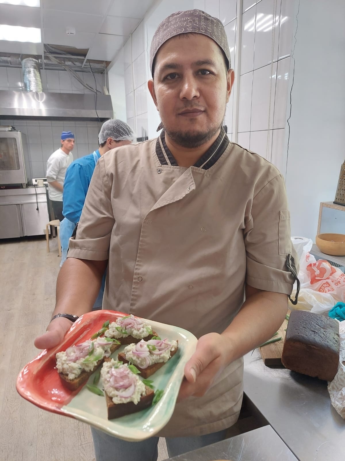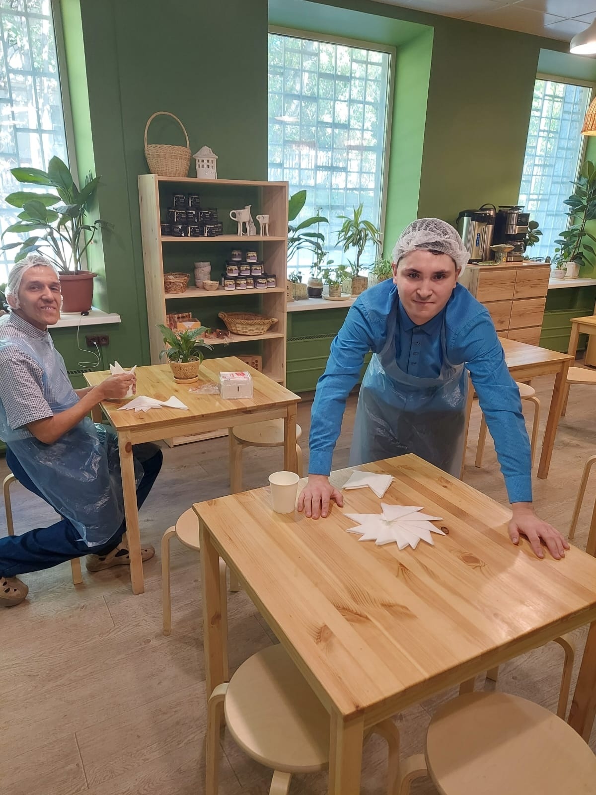 Про кафе. Представляем инклюзивную команду: главный повар Ашер с помощниками Яной и Рустамом, официанты Саша и Максим. Ребята по будним дням готовят обед для работников мастерской. И это уже привычно. Но вот этот субботний квест оказался для поваров серьезным вызовом.