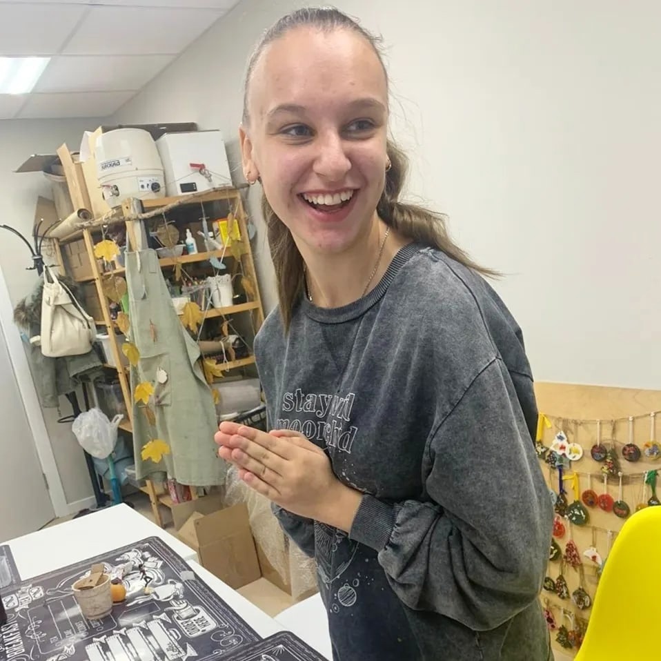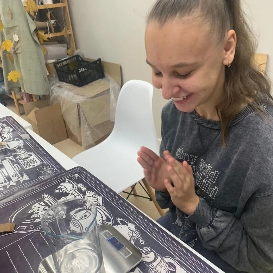 Полина - это пример такого роста над собой. За время работы в ТОКе она научилась адаптироваться к меняющимся условиям, взаимодействовать с большим количеством ребят, помогать и просить о помощи. Попробуй попроси о помощи, если почти не говоришь! Но особая связь появляется. Это победа и Полины, и тех, кто с ней работает. В работе Полина тоже преуспела - учится шить, вязать, расписывать ткань при помощи штампиков, изготавливать катаные свечи. Пока что - при помощи куратора, но все впереди.
